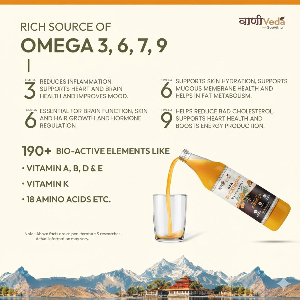 Discover the pure power of Himalayan wellness with Vaaniveda Sea Buckthorn Juice (Pulp) — a superfruit concentrate crafted from handpicked berries grown in the high-altitude valleys of the Himalayas. Known for its exceptional nutrient profile, Sea Buckthorn is one of nature’s richest sources of Natural Vitamin C, Omega 3-6-7-9, and powerful antioxidants.
